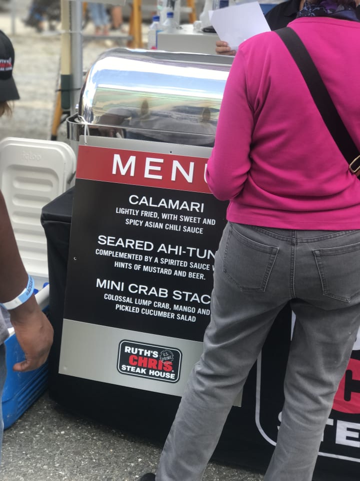 As soon as we entered the gates we were greeted by our awesome host Stacy McCaron (shoutout to Stacy!) and then immediately ushered by one of Ruth Christ's lovely representatives to their stand. After much debate we were convinced, not that I needed much convincing, that the seared ahi tuna was the way to go. It was perfectly seasoned and seared with a spirited mustard and beer sauce. The tuna was amazingly delicious, and the pickled cucumber was the perfect accompaniment for this dish. As you can see we were off to a great start for this event.