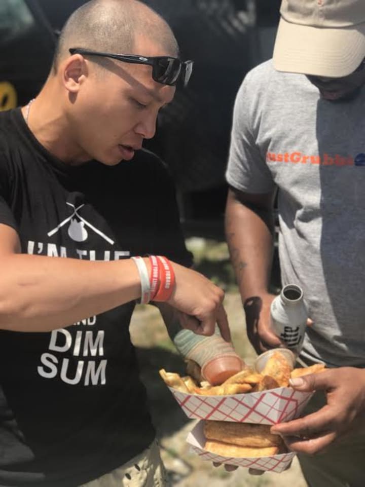 We had to retreat to the car for a 10 minute relax and recharge sesh just to get ready for the tail end of our mission. Dump N Roll. Please take the time to familiarize yourself with these guys. On the way to the festival I looked through their online menu and automatically knew this was where I was going. Yes, my name is Maurice and I'm an addict of all food Asian. I was super anxious to get a chance to shoot my shot and it was a wet Steph Curry splash. The owner Peter Tong and his larger than life personality is a story in itself, but blessing us with basically a 4 person dumpling sampler was the perfect introduction for me. We were given the vegetable and pork dumplings, crab rangoon, and a chipotle turkey bacon cheeseburger tempura wonton all with accompanying sauces, out of which the roasted garlic soy was my favorite. As good as every offering was for some reason the vegetable dumpling stood out the most. The veggies were sautéed and cooked in an Asian soy wash, wrapped in wontons, steamed and then pan fried. They were a major key and I'm grateful *Dj Khaled voice*.