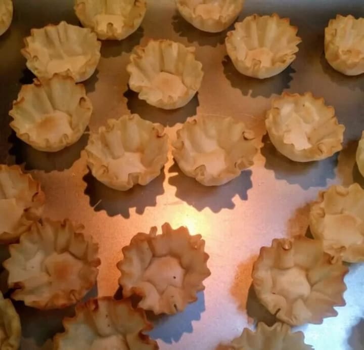 ~Place frozen tart shells onto a baking sheet and bake for 5 minutes.