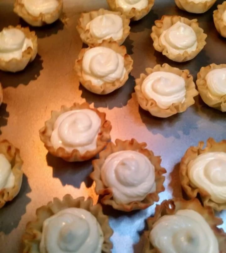 ~Pipe into tart shells. You can try to spoon the mix in but we honestly had a hard time because the shells are so small. Plus, were messy bakers apparently.