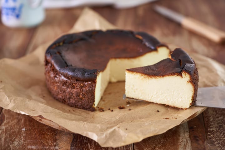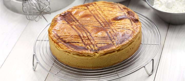 Basque cake is a classic cake that includes two layers of shortcrust pastry and a filling of black cherry preserves or vanilla pastry cream. Other flavorings can include lemon zest, rum, or almond extract.