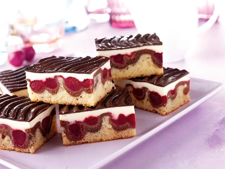 Donauwelle is a German and Austrian sheet cake. The cake consists of two pound cakes. One cake is on the bottom flavored with vanilla while the other is on top flavored with chocolate. On top are cherries, buttercream, and chocolate ganache. As the cake bakes the cherries slide to the bottom and make a wavy pattern.