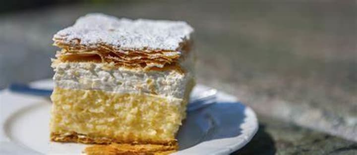 Kremna rezina is a tasty cream cake that originated in the Lake Bled area. This cake includes a golden, crispy, buttery pastry as the base and it is topped with vanilla custard, whipped cream, and a layer of thin, buttery dough, Once baked the cake is dusted with icing sugar and cut into cubes.