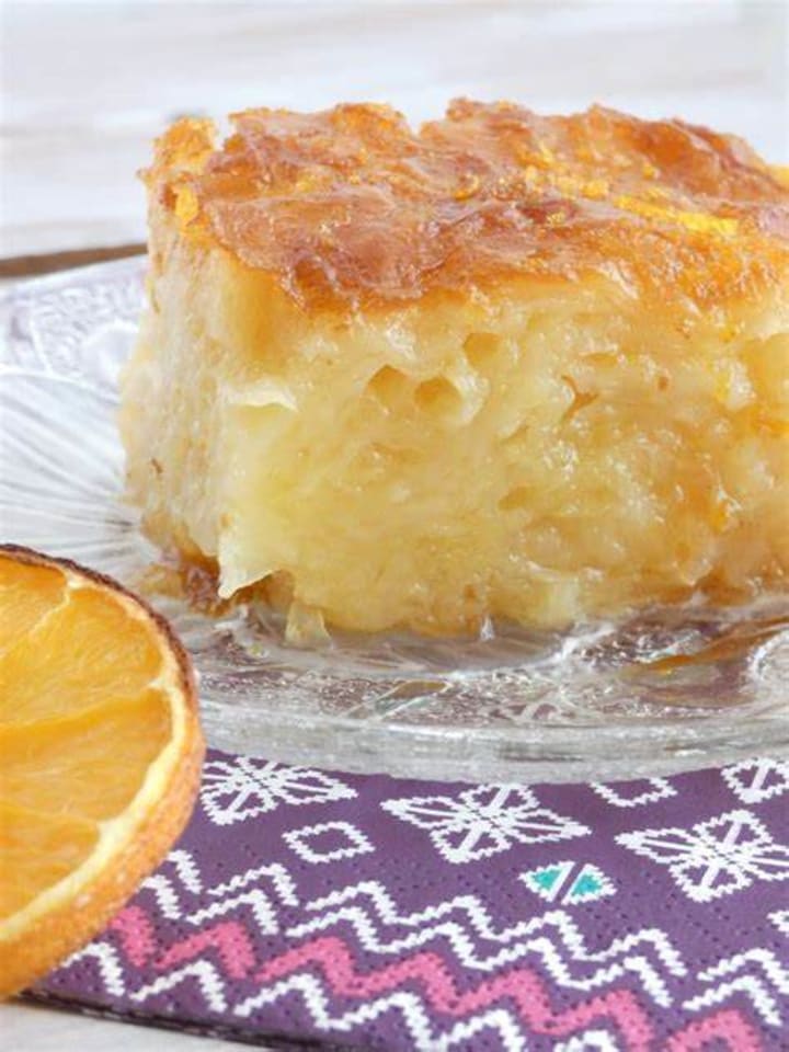 Portokalopita is a cake that is made with layered or torn phyllo sheets blended with creamy, orange-flavored yogurt custard. The cake is doused with a thick sugary orange-spiked syrup.