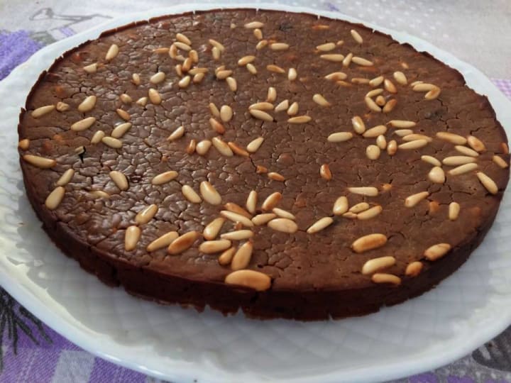 Castagnaccio is a traditional Italian chestnut cake. It is made with chestnut flour, olive oil, rosemary, raisins, and pine nuts. Since this cake does not require any other flour or sugar it is gluten-free and sugar-free. Occasionally other ingredients can be added like dried fruit but the traditional version has only raisins.