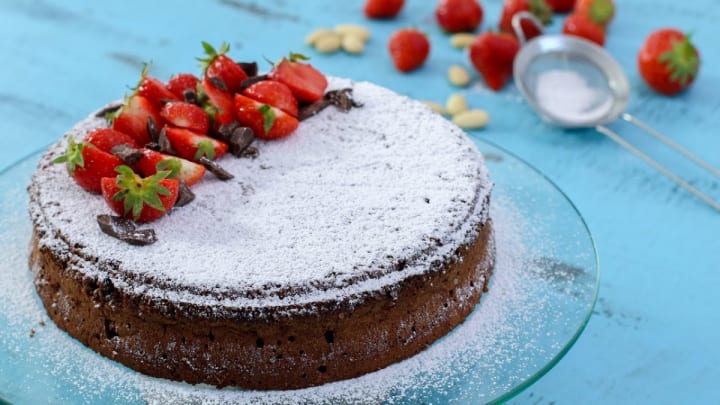 Torte Caprese is a delicious dark chocolate cake that is made without flour. The cake originated on the island of Capri. It is prepared with dark chocolate, eggs, sugar, almonds, and butter. The cake is garnished with halved strawberries or raspberries.