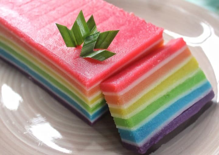Kue lapis or kuih lapis is a traditional cake that I would personally call a rainbow cake. It is prepared with a moist layered pudding-like cake. The cake is made with rice flour, sago, sugar, salt, coconut milk, and red, green, and pink food coloring.