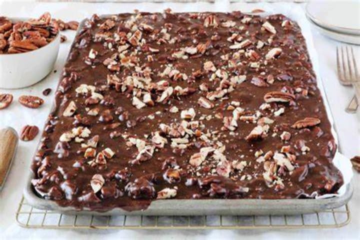 Texas sheet cake is an amazing chocolate dessert. It is made with buttermilk, eggs, vanilla, baking soda, sugar, flour, butter, and cocoa. The ingredients are combined and spread into a sheet pan, After baking the cake is topped with crunchy icing that includes chopped pecans.