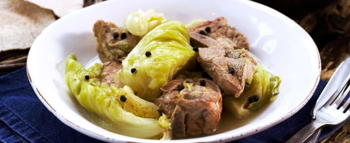 Farikal is a simple and delicious dish. It consists of layers of lamb and cabbage cooked slowly with whole black peppercorns. It is served with boiled potatoes garnished with parsley.