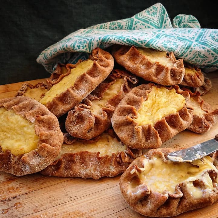 Karelian pasties are made with pastry shells made with flour, rye flour, cold water, melted butter, and salt. Once the shells are made they are filled with a combination of rice, egg, water, milk, and butter which are boiled together into porridge.