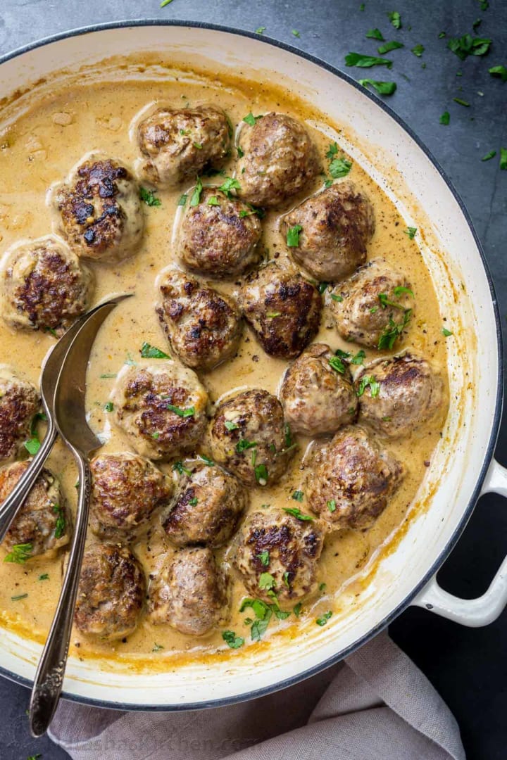 Swedish meatballs are a delicious combination of ground beef and ground pork, onion, seasoned bread crumbs, beaten eggs, ground black pepper, and salt. The meatballs are boiled in broth. A cream gravy is prepared and poured on the meatballs. They are usually eaten with mashed potatoes.