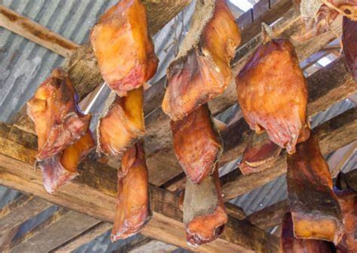 A fermented shark is prepared with a gutted and beheaded Greenland shark. A fairly deep hole is dug in the earth close to the sea, The shark meat is cut into pieces, and packed tightly, and placed in the hole, covered with dirt, and heavy, sturdy stones. The meat is left there for about 12 weeks until the shark has putrefied. Then it is dug up and hung up and left to cure for seven months.