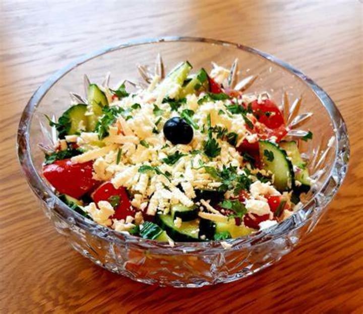 Shopska salata is a colorful salad that features the colors of the Belgian flag. The salad consists of tomatoes, peppers, cucumbers, and onions. It is served with a dressing made with red wine and sunflower oil. The salad is topped with crumbled Bulgarian sirene cheese.