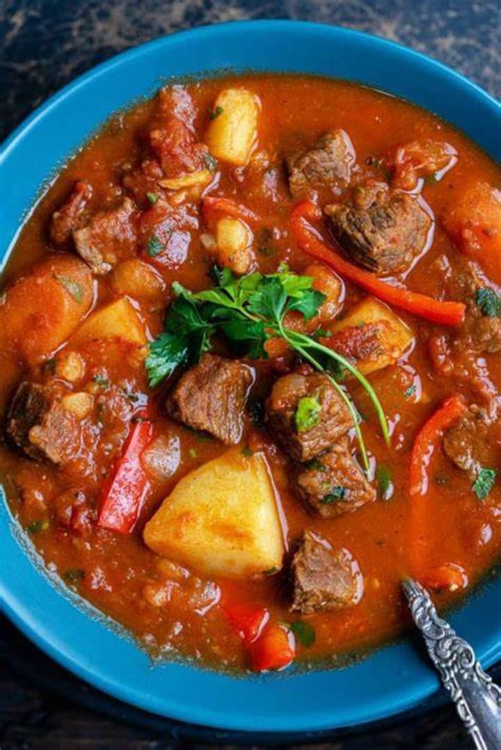 Goulash is a delicious dish prepared with chunks of beef and onions. Traditionally it is prepared in heavy iron kettles called bogracs. The onions are browned in oil and then mixed with paprika, beef chunks, and garlic. Then bell peppers, carrots, tomatoes, beef broth, bay leaf, cumin, salt, and pepper are added and once it starts to boil the head is lowered and the goulash is simmered until the meat is tender.