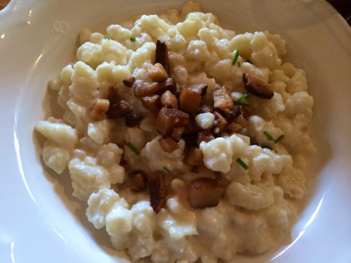 Kasknopfle is a baked cheesy pasta dish. It is a combination of pasta and three kinds of cheese to make a creamy sauce. The cheeses are Gruyere, Emmenthal, and Fontina.