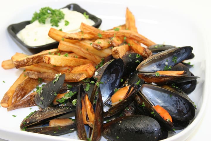 Moules frites is a delectable Belgian dish. It is made with steamed or poached mussels in white wine, shallots, and garlic. They are served with French fries or frites.