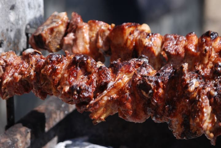 Souvla is a popular dish for all kinds of gatherings. It is made with large cuts of pork, lamb, or chicken cooked on long rotating skewers over charcoal and cooked a long time at a low temperature.
