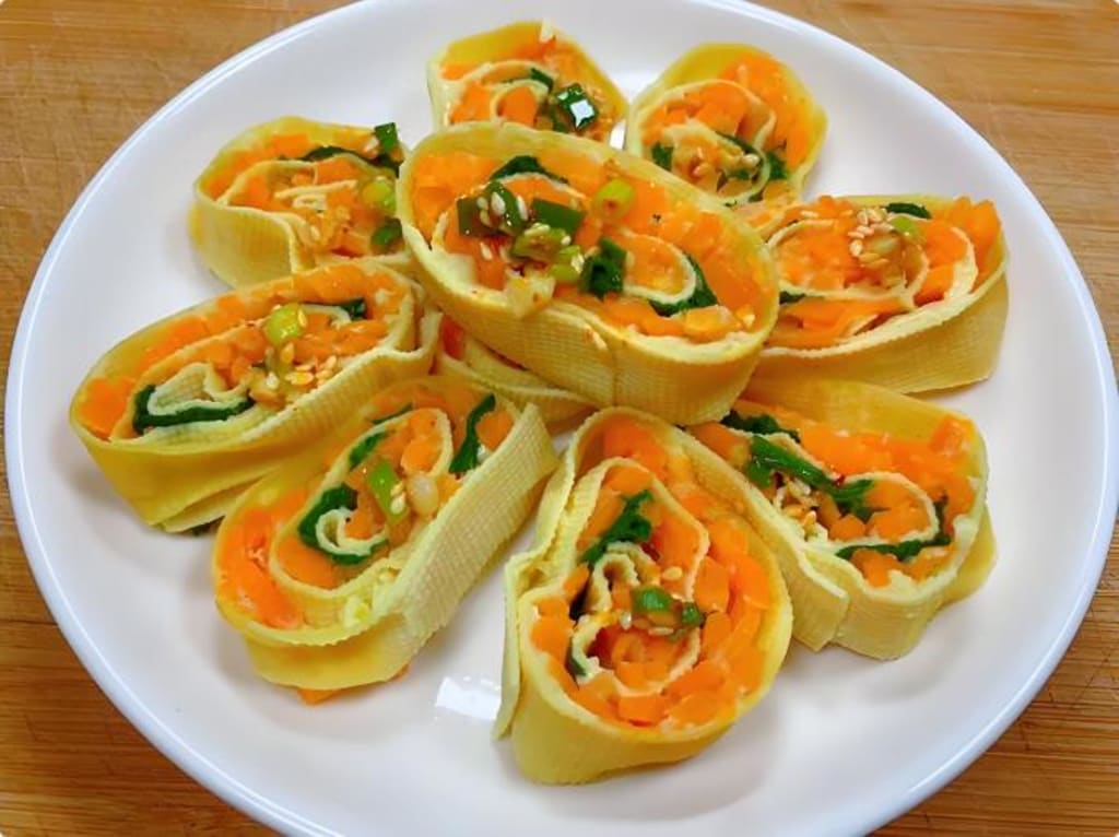 2. Soften dried tofu skins (yuba) in warm water. Lay flat, spread carrot-spinach mixture evenly, roll tightly, and steam for 5–8 minutes.