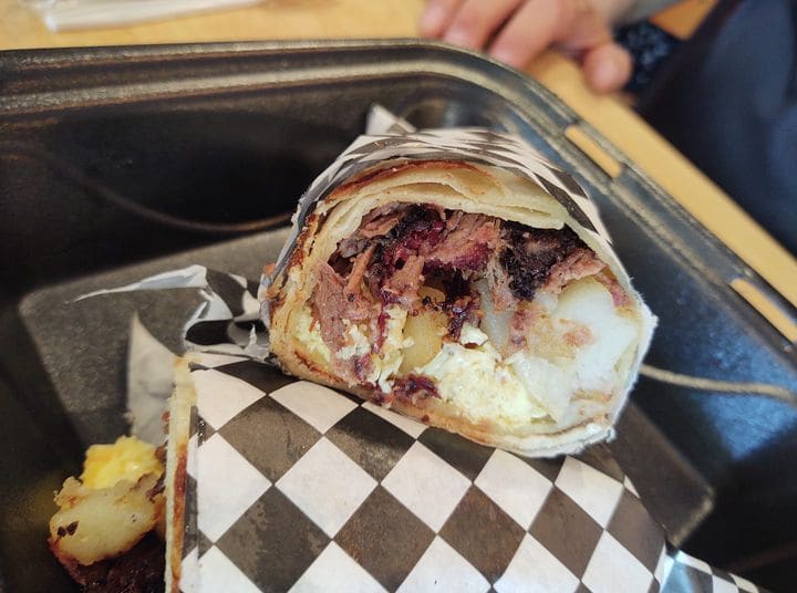 We enjoyed a brisket burrito that was so large we most assuredly should have split it. The eggs and potatoes were excellent, but the scrumptious burnt ends in the burrito made my mouth water! Normally I don't like burritos because the flavors seem muddled. This was completely different! The burnt ends used in the burrito created a beautiful savory experience that was tantalizingly unique.