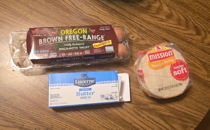 So you get about 3 eggs, or however many your hands can hold... or whatever you want to eat... Just remember keep the egg/tortilla ratio pretty even if you're wanting to make it for more people. I feel like as a 190lb woman, 3 eggs/3 tortillas is plenty satisfying. Adjust according to how many people you're cooking for.