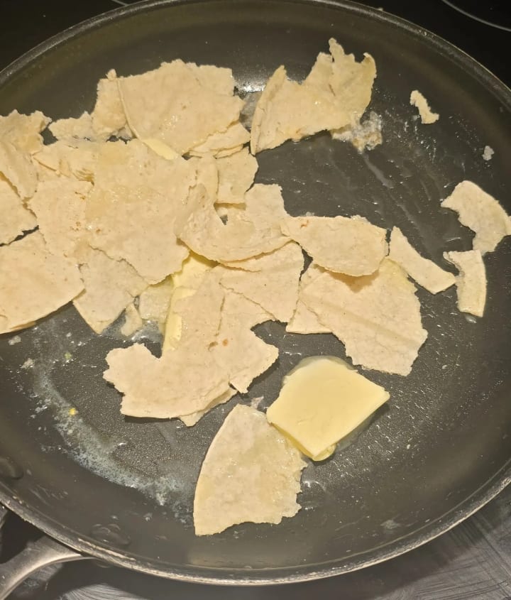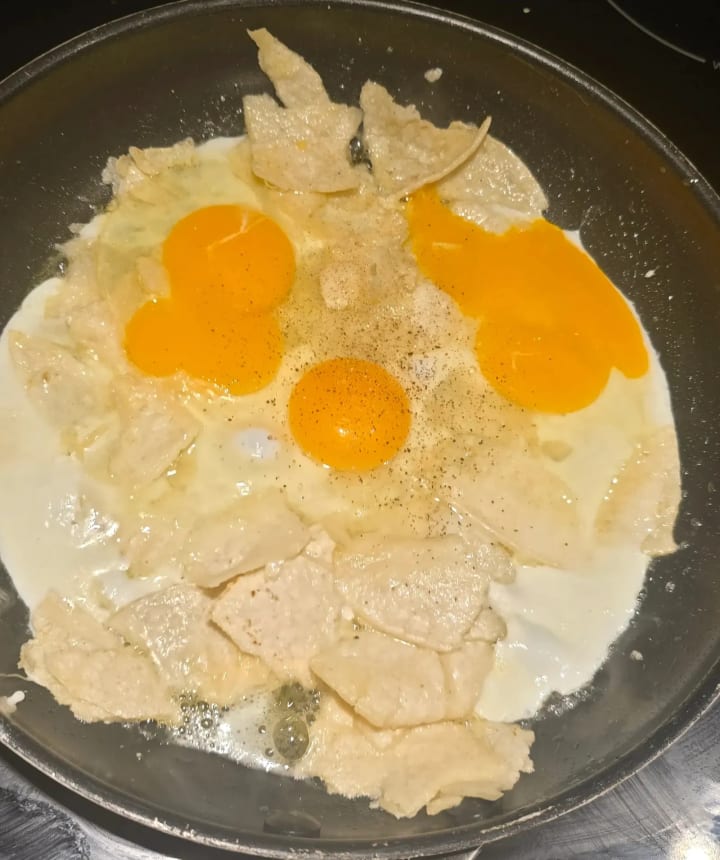 Living in a single parent household most of my life, this quick and easy recipe was a staple a lot of the time. It's protein and omega rich thanks to the eggs, and the added tortilla pieces help the dish stretch to satiate the person eating it. Even my nieces have learned to make it for their families just because it is something that any scrambled egg lover can enjoy. So needless to say, it has " family dish " power to it.