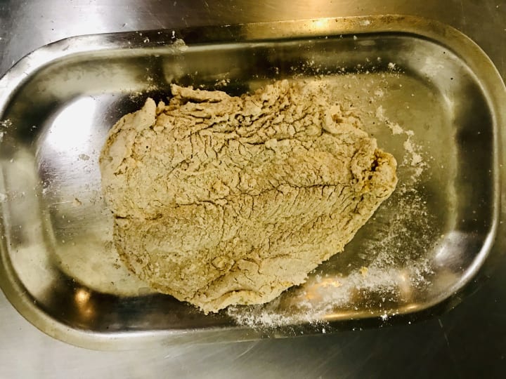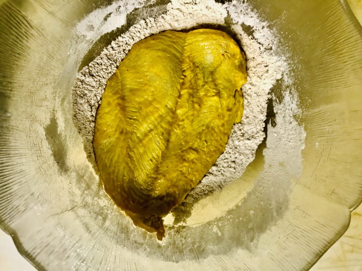 Now that several hours have passed take your chicken breast out of the bag and shake off the excess mustard.