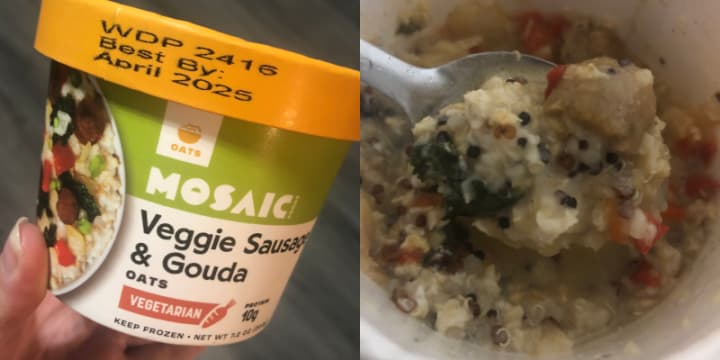 I cracked open the Veggie Sausage and Gouda Oats right away because I was excited to try a savory take on oatmeal. This variety offers a new twist on vegan meat, too. Forget about the jackfruit and seitan: Mosaic somehow turns dried apples into plant-based sausage.