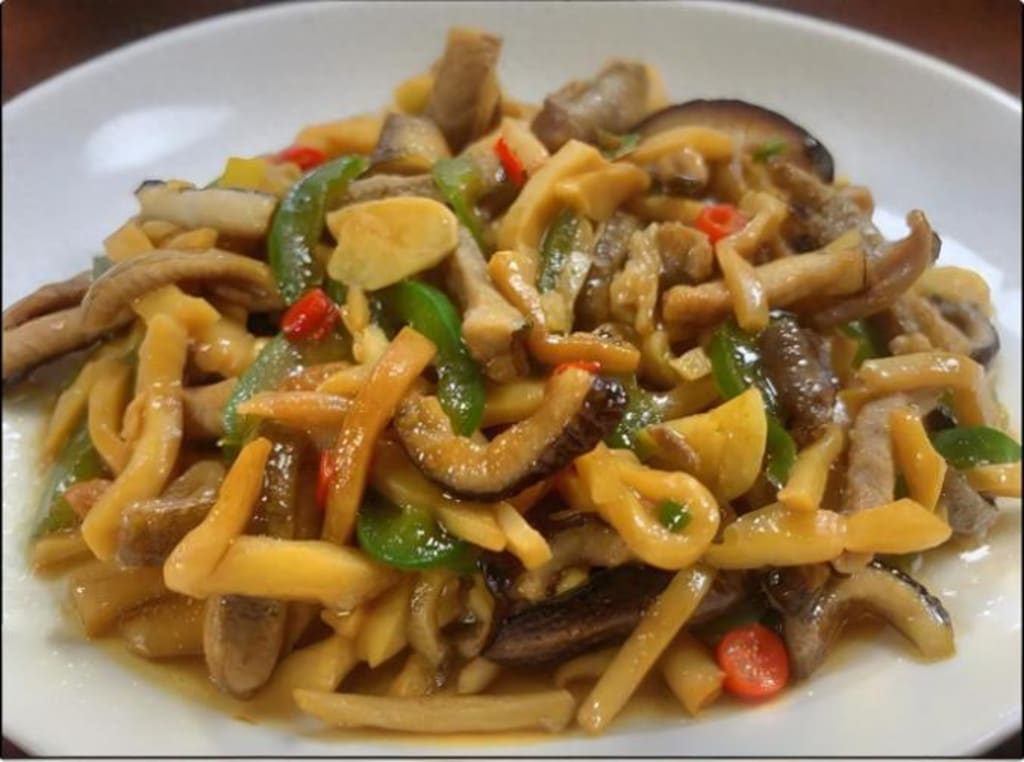3. In the same wok, stir-fry king oyster mushrooms until soft, then add green peppers until tender. Stir in a tablespoon of fermented soybean paste for aroma.