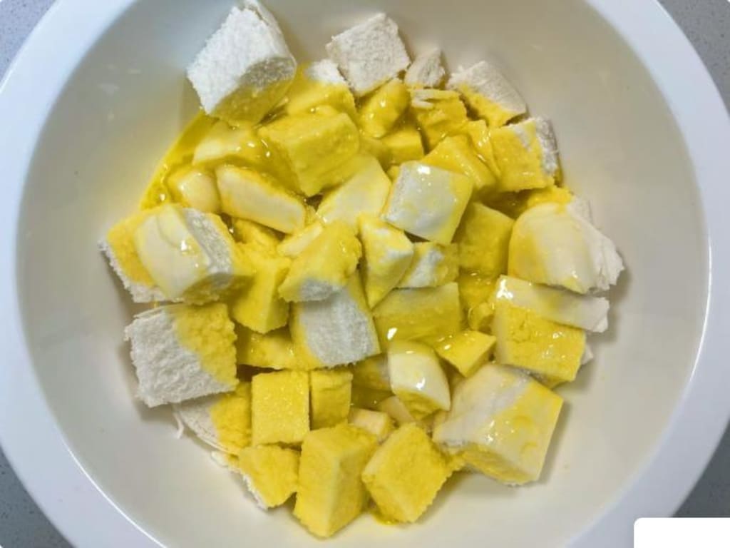 Heat a generous amount of oil in a pan (too little oil will make them stick or dry out). Once the oil is hot (test by hovering your hand above—you should feel the heat), reduce to medium heat and pour in the egg-coated bun cubes. Don’t stir immediately! Let them sit for 10–15 seconds so the bottom layer sets, then gently flip and stir. Keep stirring patiently as the cubes turn golden and crisp, developing a slightly crunchy exterior while releasing a rich, eggy aroma. Once uniformly golden, remove them from the pan and set aside.