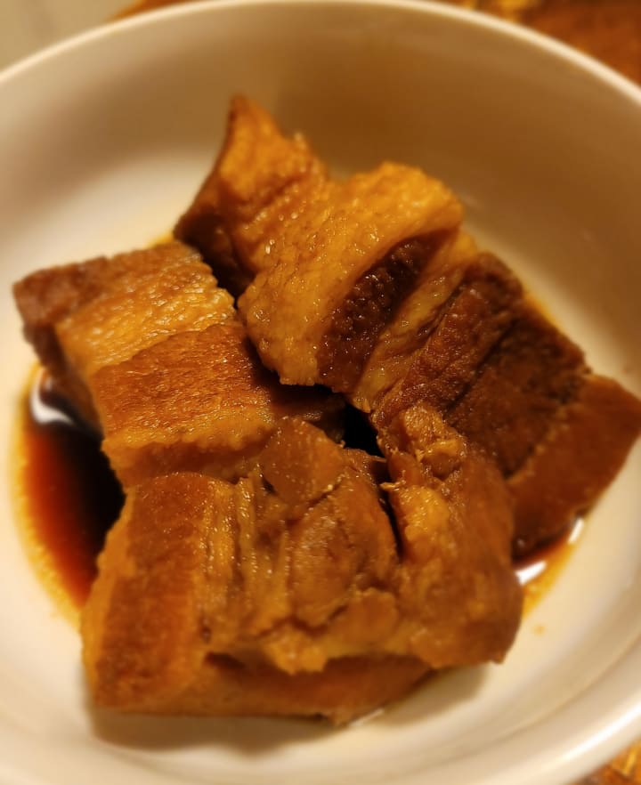 Braised pork belly. Hawaii knows it as a shoyu pork, Japan, kakuni. So what makes this dish inherently Okinawan?