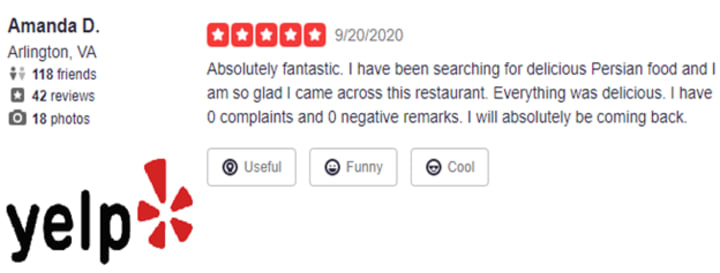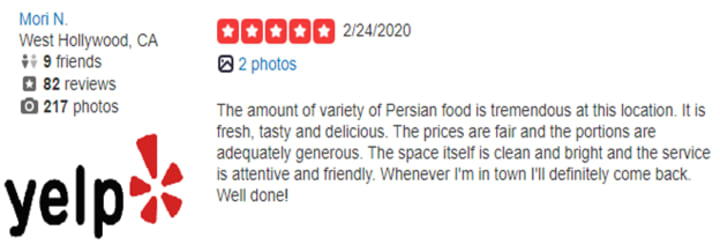 They use the traditional recipes to prepare amazing Persian food, and following this tradition, Pasargad Restaurant only uses the finest fresh ingredients to prepare its dishes and exclusive cocktails. They offer the most delicious Iranian cuisine foods, from warm and cold starters to lamb & chicken grilled dishes. Nice ambiance, accommodating staff, excellent service, and best of all - fantastic food, will keep you coming back here.