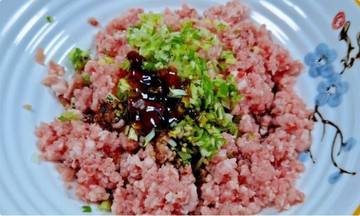 Choose a well-marbled cut of pork, like shoulder or picnic roast, with a fat-to-lean ratio of about 3:7. Hand-chopped meat yields the best texture, but store-bought ground pork works too—just make sure it’s fresh and has some fat. Place the meat in a large mixing bowl. Here’s the key step: hydrate the meat! In a small bowl, steep a few slices of ginger, some scallion whites, and a pinch of Sichuan peppercorns in hot water. Let it cool into an aromatic infusion. Gradually add this liquid (about half a cup total) to the pork, a little at a time, stirring vigorously in one direction until the meat absorbs it all. Then season with light soy sauce, dark soy sauce, oyster sauce, salt, a pinch of sugar, white pepper, and sesame oil. Beat the mixture until it becomes sticky and well-combined.