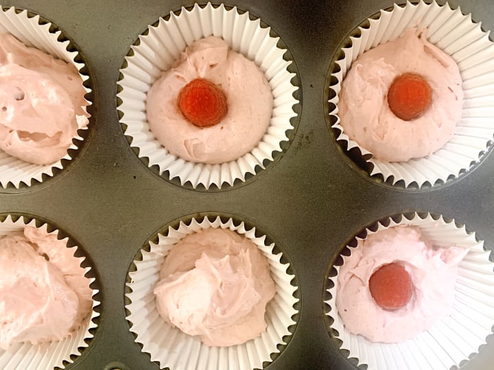 - Put a raspberry each into the cupcake cases and press it down slightly