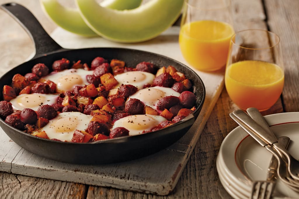 We're all familiar with the traditional brunch fare of strata, quiche, eggs Benedict, omelets and the like, all of which are delicious choices. But if it's time for a brunch reboot to wow your guests and their taste buds, Aunt Nellie's has the perfect suggestion: Baby Beet and Potato Hash with Chorizo. One skillet … one delicious brunch dish.