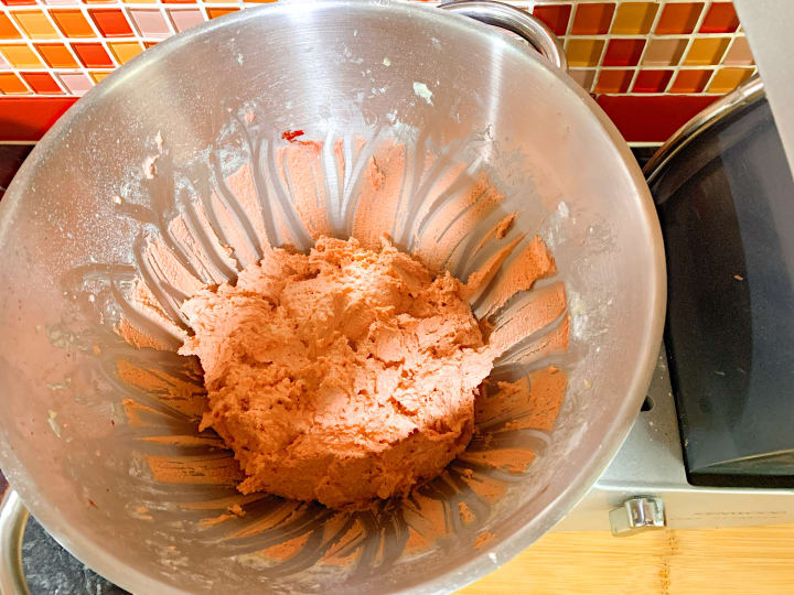 - Add the cocoa powder, the toffee hot chocolate powder, the bicarbonate of soda and the red food colouring into a separate bowl. Mix these together until they have blended with each other