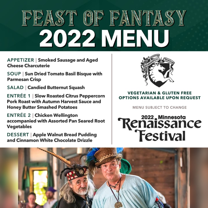 The Feast of Fantasy. This six course meal of appetizer, soup, salad, two entrees, dessert, and bottomless wine or beer. The menu is top notch, changes every year.