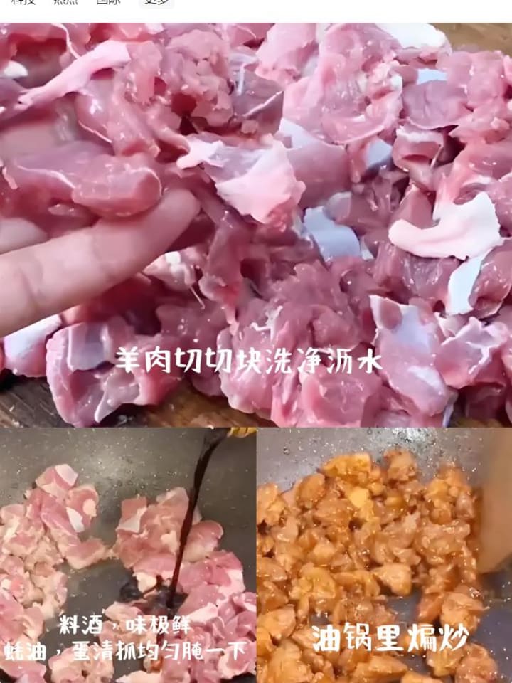 1. Cut lamb into thumb-sized strips. Marinate with 1 tbsp light soy sauce, ½ tbsp dark soy sauce, ½ tbsp cooking wine, and 1 tbsp cornstarch. Massage until coated and let sit 15 minutes.