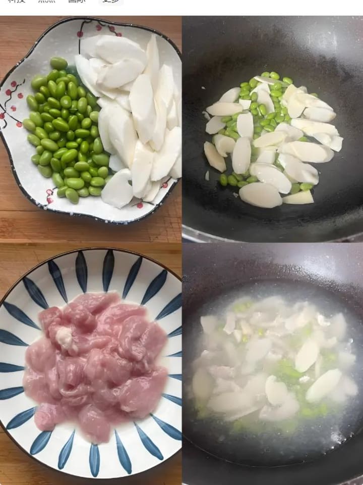 • Edamame Soup: Pork slices demand gentle treatment