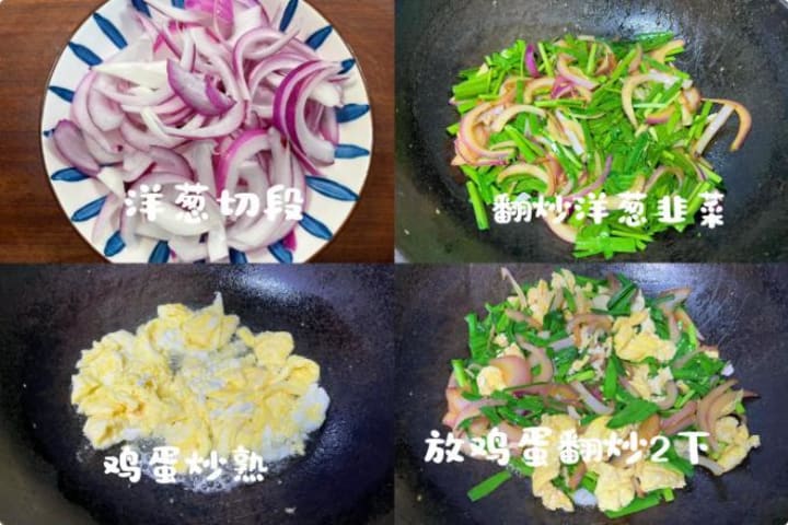 1. Cut leeks into inch-long sections and slice onions into thin strips. Beat eggs with a pinch of salt and a splash of cooking wine.