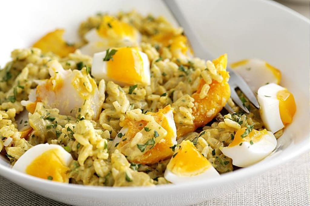 Kedgeree was created during the 19th century, British Raj. The dish is prepared with hard-boiled eggs, smoky fish, and rice seasoned with a blend of warm curry spices among them fenugreek and coriander. Kedregree has become a popular breakfast food in England and in Scotland, it's made with smoked haddock.