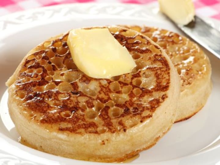 Crumpets are small, round cakes or bread usually a part of teatime and can be eaten at breakfast. These are cooked on a griddle. They are a combination of flour, milk or water, yeast, sugar, salt, and baking powder. They are soft, spongy, and have a chewy texture.