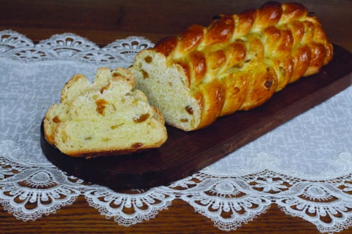Houska is a popular small bread roll. It is prepared with plain wheat flour, water, yeast, salt, and occasionally eggs. It is braided before baking and shaped into a circular form that looks like a knot. The top is sprinkled with coarse sea salt and either caraway or poppy seeds. The exterior is crunchy and the center light and soft. These can be bought in bakeries and supermarkets. They are eaten for breakfast with a variety of sweet and savory spreads, butter, or marmalade.
