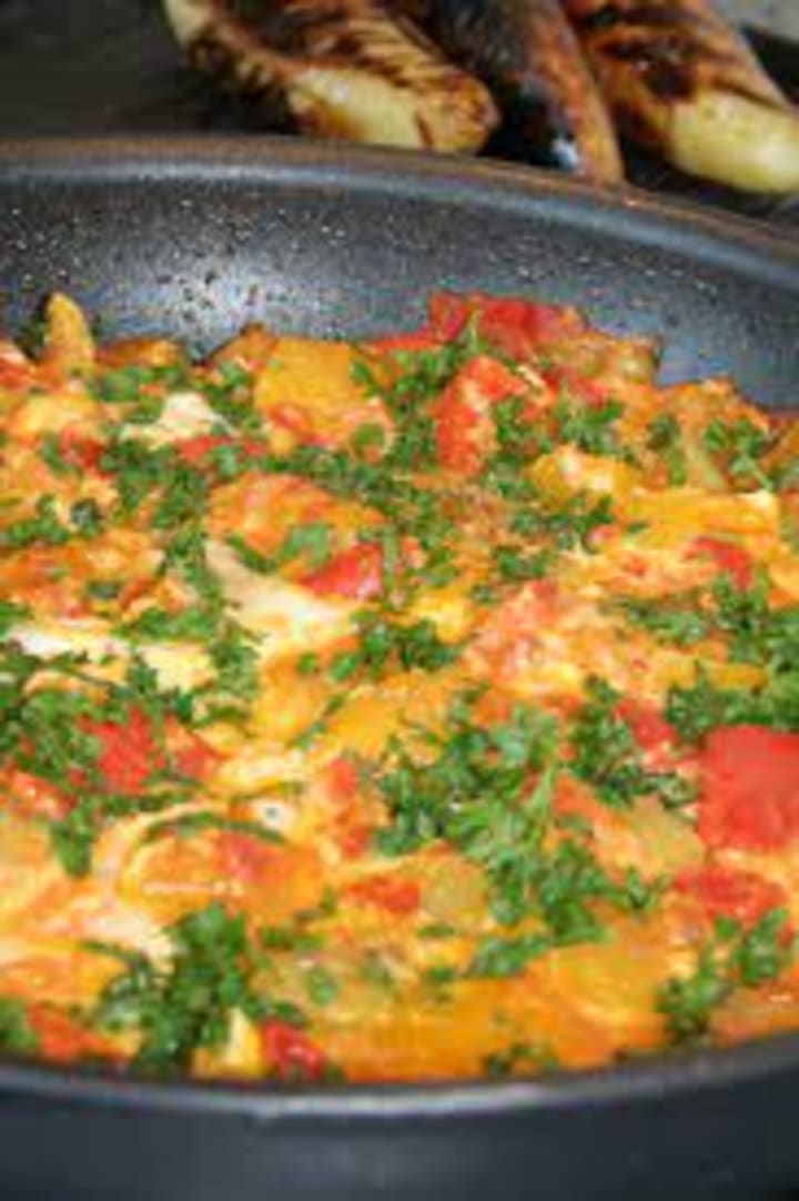 Greek omeletta is similar to a frittata. The dish is prepared with fried potatoes, eggs, and vegetables like bell peppers. The omelette is baked on both sides. It can be served with sausages, lemon wedges, and salad.