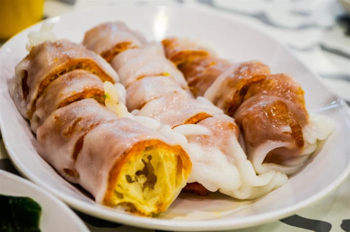 Zhaliang are traditional deep-fried crullers wrapped in silky and translucent rice sheets. They are commonly served for breakfast but can be part of traditional Cantonese dim sum meals. They're served cut into bite-sized pieces and garnished with sesame seeds and sliced scallions.