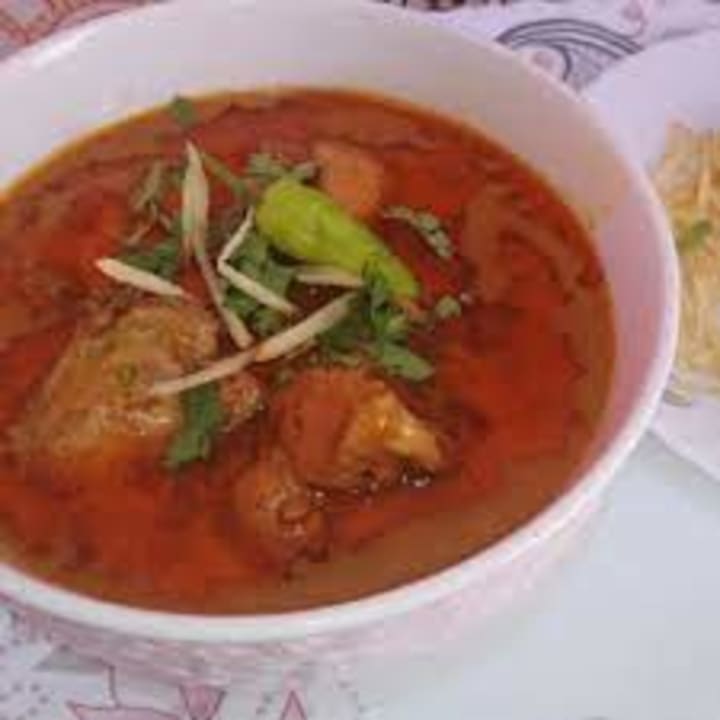 Nihari is a popular meat dish that originated in Old Delhi. The dish is prepared with slowly cooked meat like beef shanks, mutton, or chicken. The meat is cooked with stock and spices like cloves, cumin, garam masala, and cardamon in big vessels sealed with dough. It takes from six to eight hours to cook and is traditionally eaten for breakfast. The name of the dish is derived from the Arabic word nahar which means morning.