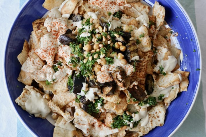 Fatteh is a Levantine specialty prepared with pieces of fresh, toasted, or stale flatbread and many other ingredients. The two main varieties are Levantine topped with yogurt, chickpeas, olive oil, and cumin and Egyptian. Fatteh can also be topped with chicken, lamb, or pine nuts and is usually eaten for breakfast or in the evening as the main meal.