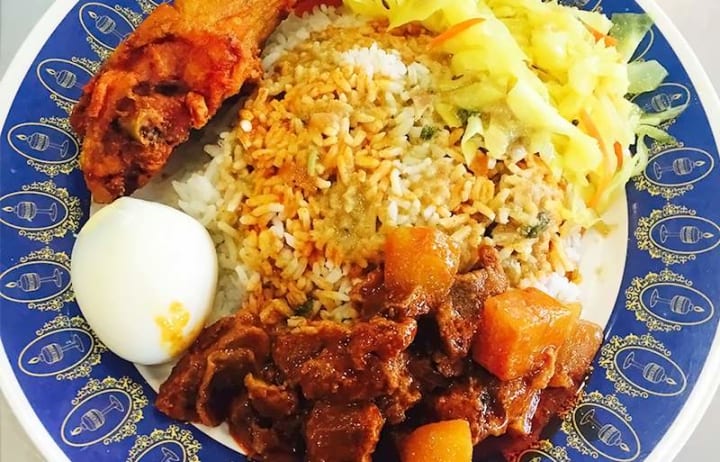 Nasi kandar is a classic dish with steamed rice and a variety of curries, sides, and condiments, The rice is seasoned and the curries can include a combination of meat, seafood, or vegetables. It is traditionally enjoyed as a warm breakfast.