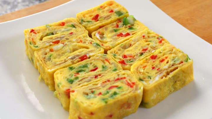 Gyeran mari is a rolled omelette prepared with lightly beaten eggs and filled with finely sliced or diced scallions, carrots, peppers, mushrooms, zucchini, cheese, ham, bacon, or nori seaweed. It is usually served sliced and is a popular breakfast dish.