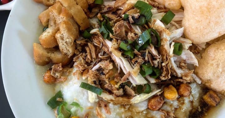 Bubur ayam is the Indonesian version of chicken congee. Thick rice porridge is topped with shredded chicken and savory condiments. It is a breakfast staple. Chicken is boiled and the same broth is used to cook the rice until it thickens.