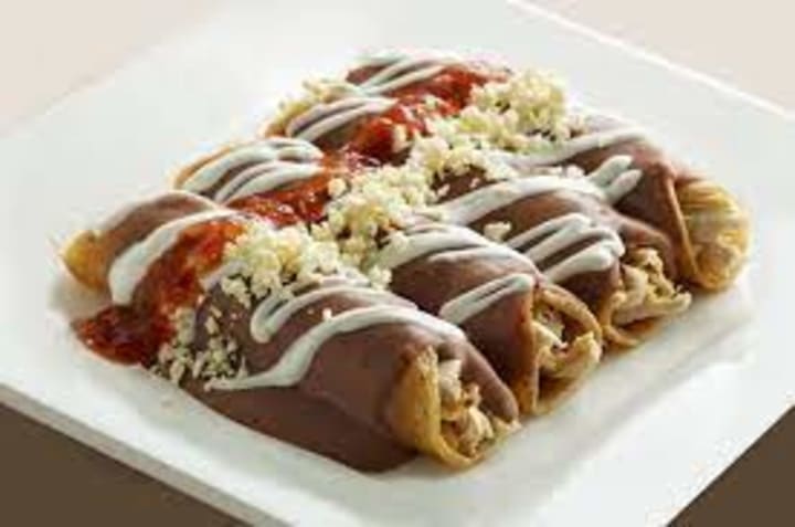 Enfrijolada is a dish that is prepared with fresh corn tortillas smothered with beans in their liquid. The choice of fillings are shredded cheese, chicken and various vegetables. It is usually eaten for breakfast.